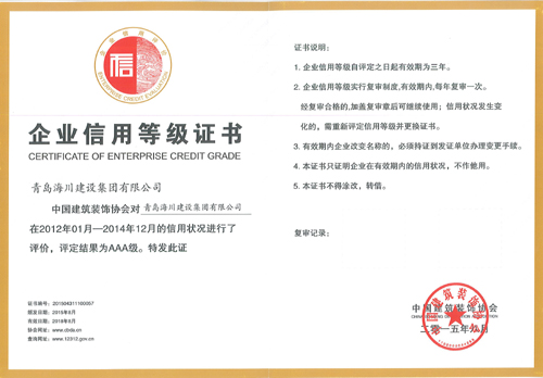 “企(qi)業信(xin)(xin)(xin)用評(ping)價AAA級信(xin)(xin)(xin)用企(qi)業” 是中國建(jian)筑裝飾(shi)協(xie)會遵循公(gong)(gong)平(ping)、公(gong)(gong)正(zheng)、公(gong)(gong)開(kai)的原則,為推進企(qi)業社會責(ze)任、提升企(qi)業公(gong)(gong)信(xin)(xin)(xin)力(li)、增強消費(fei)者(zhe)信(xin)(xin)(xin)心、樹立(li)行業誠信(xin)(xin)(xin)標(biao)桿而開(kai)展的評(ping)選(xuan)活動,只(zhi)有(you)行業內規模較大(da)、市(shi)場占有(you)率(lv)較高(gao)、經(jing)營效(xiao)益水平(ping)較高(gao),且在業界(jie)具有(you)良好(hao)信(xin)(xin)(xin)譽評(ping)價的企(qi)業才能最終(zhong)獲評(ping)。青島(dao)海川集團憑借(jie)規范的企(qi)業運作和(he)誠信(xin)(xin)(xin)經(jing)營光榮登榜。